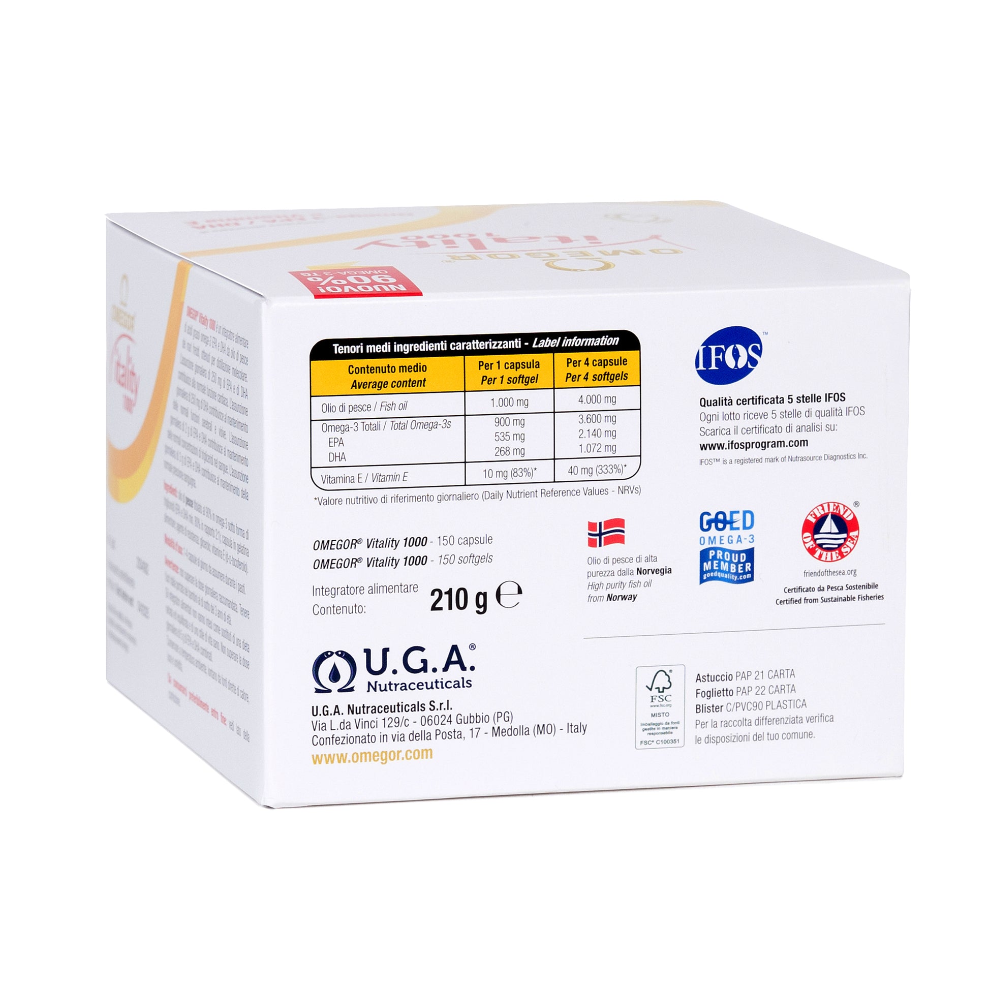 Omegor Vitality is our most popular omega-3 concentrate, obtained through a patented purification technology. Since its launch in 2005, all its commercial batches have been rated 5 stars for potency, freshness and purity by the IFOS. At 90% concentration, it provides more omega-3 per serving than most other omega-3 products. Plus, with omega-3 in the form of triglycerides, it ensures optimal bioavailability and no odor or aftertaste typical of most common fish oil supplements.